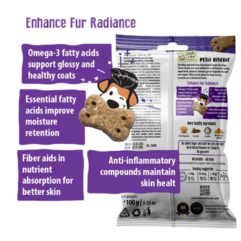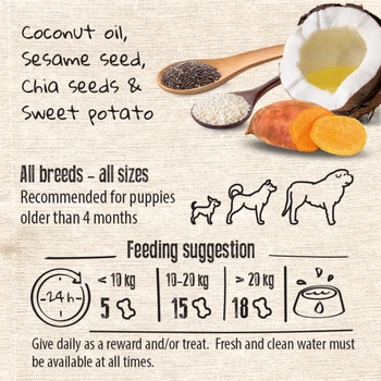 Kombinácia kokosového oleja, sezamových semienok, chia semien a batátu podporuje krásnu srsť a zdravú pokožku zvnútra. Vhodná ako odmena alebo len tak na rozmaznávanie – kedykoľvek!