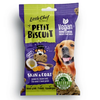 Little Chef SKIN & COAT je chutná, vegánska, funkčná maškrta, ktorá pomáha udržiavať zdravú pokožku a lesklú srsť tvojho psa. Ručne vyrábaná v malých dávkach, pri nízkej teplote, výhradne zo superpotravín a prírodných surovín v potravinárskej kvalite. Bez obilnín a hypoalergénna – ideálna aj pre citlivých psov.