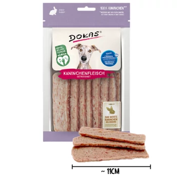 Dokas sušené králičie mäso je prirodzená a chutná maškrta pre psov. Vyrobená zo 100 % králičieho mäsa, šetrne sušená na vzduchu – ideálna ako odmena medzi jedlami. Ľahko stráviteľný, nízkotučný, no na bielkoviny bohatý snack vhodný pre psy všetkých plemien a vekových kategórií. Zloženie:93 % králičie mäso, vedľajšie produkty rastlinného pôvodu, minerálne látky Analytické zložky: